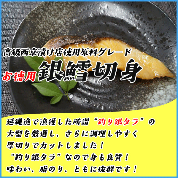商品 ギンタラ切身(加熱用) 内容:80g×10枚入 原材料:ギンタラ(アメリカ産) 賞味期限:配送日から1か月推奨 ※賞味期限に関してのご注意 各商品のパッケージには個別の賞味期限が記載されております。